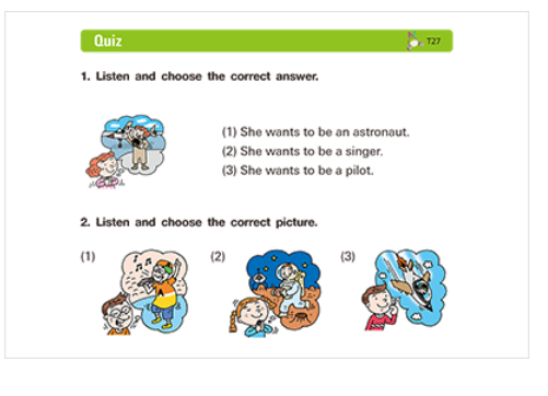 中級でも、くらしに関わる会話表現を覚えたり、さらには、検定試験などでおなじみの形式でクイズ問題にチャレンジしたり。長文の内容に関するクイズ問題にもチャレンジしたり。