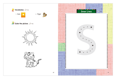 例えば入門だと、アルファベットと簡単な単語の読み書きをフォニックス(phonics)で習得。チャンツ(歌)やぬり絵などを通じて英語が学べる工夫がされたテキストも使用します。(以下テキスト画像はLepton公式サイトより引用)