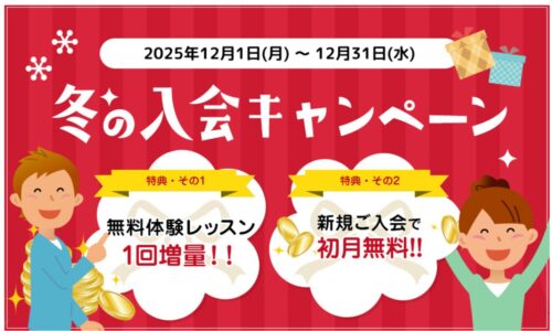 - 内容:上記期間中に無料体験申込みで、さらにレッスンチケット(1回分)プレゼント(2,875円相当)